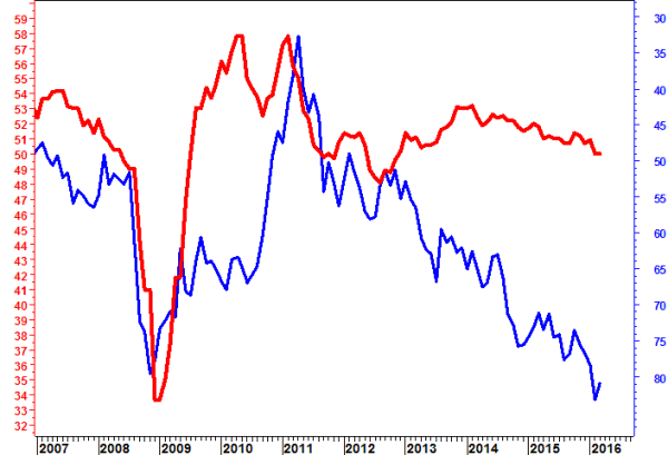 Per cui è ben possibile che da qui in poi il GSR (qui in alto in scala rovesciata) inverta direzione, svoltando verso il basso. Ma non è affatto detto che ciò possa associarsi ad una ripartenza del Global PMI, a sua volta a ridosso della rilevante soglia spartiacque dei 50 punti.