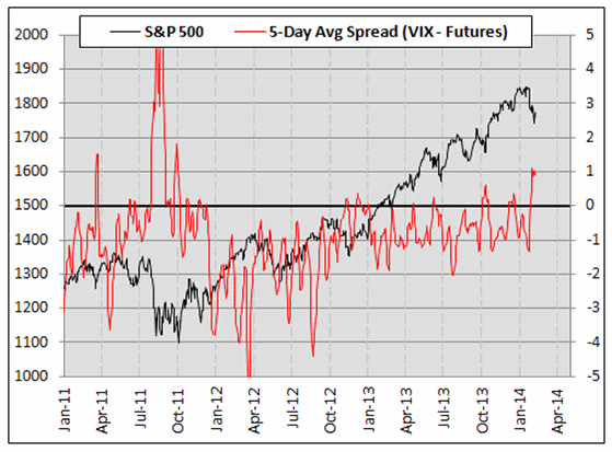 Nell'arco di poche settimane, lo S&P500 ha ceduto il 6% dai massimi assoluti. Ciò ovviamente ha prodotto una fiammata sul VIX, che tipicamente mostra una relazione inversa rispetto al mercato azionario. Tuttavia, il balzo del VIX non ha trovato eco in analogo rialzo del future, con il "cash" che ha raggiunto il differenziale più ampio dal terzo trimestre del 2011. In altre parole, il mercato a termine si aspettava che la volatilità si sarebbe ridimensionata, ed ha avuto ragione. Oggi esamineremo cosa è successo in presenza di circostanze simili.
