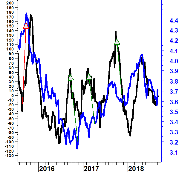 Calcolando la differenza fra due CESI, possiamo così percepire la dinamica comparata fra due realtà; ma anche, in questo caso, ottenere indicazioni preziose circa le prospettive dei rispettivi listini azionari. Come si può notare, fra "CESI spread" e MIB/DAX sussiste una notevole correlazione; il che, allo stato attuale, non ci consente di formulare congetture in ottica comparata: i due mercati si stanno comportando esattamente come sarebbe prevedibile, sulla base delle rispettive congiunture.