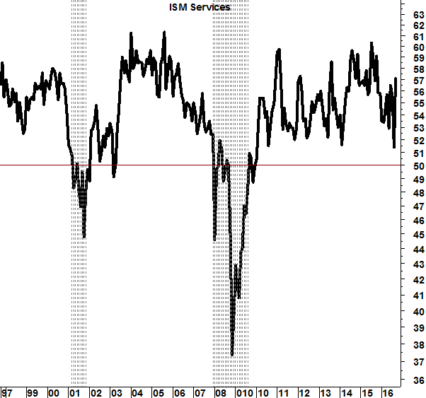 Nel dibattito circa la possibilità che l'espansione economica iniziata negli Stati Uniti oltre sette anni fa possa presto esaurirsi; non si tiene sufficientemente conto dell'impatto non solo rilevante, ma direi soprattutto determinante dei servizi. L'economia USA non si basa più sul settore manifatturiero, che da' lavoro a poco più del 12% della forza lavoro, e genera circa il 17% del valore aggiunto nazionale. I Servizi costituiscono la maggior parte del PIL, per cui giova monitorare con attenzione l'andamento del settore non manifatturiero.