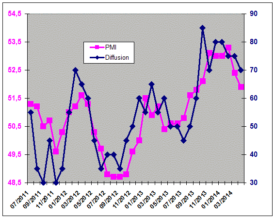 Qualche giorno fa è stata resa nota l’abituale raffica di dati sugli indicatori dello stato di salute del settore manifatturiero: i cosiddetti “PMI”. Diciamo subito che i dati non sono certo stati esaltanti: il PMI globale, pur attestandosi oltre l’asticella dell’equilibrio dei 50 punti, si attesta al livello più basso degli ultimi sette mesi. Complessivamente, l’economia tira, ma ad un ritmo meno serrato di quello sperimentato fino all’inizio dell’anno.