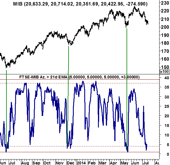 Fra i motivi che da qualche giorno suggerivano l'imminenza di un rimbalzo, c'è l'ampiezza di mercato ridotta ai minimi termini. Il numero di società del FTSE-MIB al di sopra della rispettiva media a 21 giorni, è precipitato giovedì a 2 unità; in altre parole, ben 38 società su 40 risultava in downtrend, seppur di breve periodo. Se non sono rimaste più volte azioni a fornire il loro contributo addizionale al ribasso, il mercato smette di scendere e rimbalza: è una regola praticamente fisica.