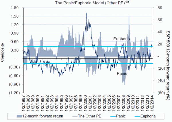 In questi giorni si discute molto della scomparsa di una figura che ci ha accompagnato per tutti questi cinque anni di boom di borsa: il Ribassista. Che fosse il piccolo investitore, il gestore professionale, lo strategist di Wall Street o il fondo hedge, questa figura è scomparsa. Ma c'è uno strumento che permette di definire con una certa precisione il livello di ottimismo degli investitori. Si tratta del Panic/Euphoria model, che Citi calcola e rende noto ogni settimana. Ottenuto dalla sintesi di diversi indicatori di sentiment - dalle azioni vendute allo scoperto al margin debt, dai sondaggi sul sentiment al put/call ratio - oscilla fra livelli ben definiti.